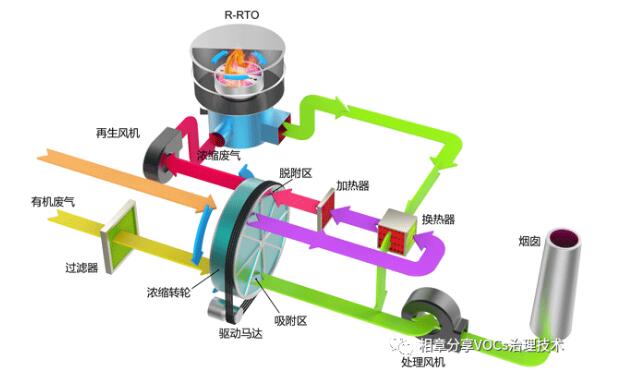 沸石轉(zhuǎn)輪濃縮+RTO運(yùn)行原理: